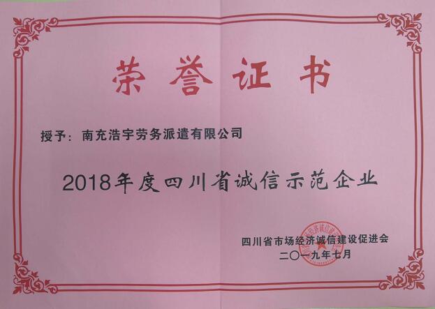 我公司获得2018年度四川省诚信示范企业