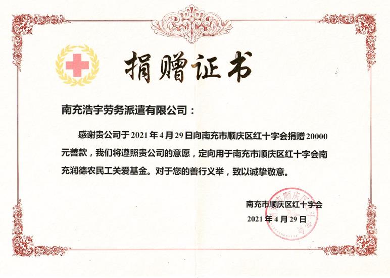 我公司向南充市顺庆区红十字会捐赠20000元善款